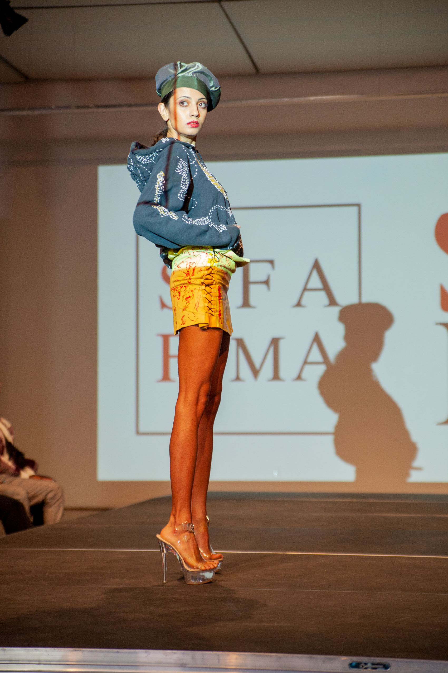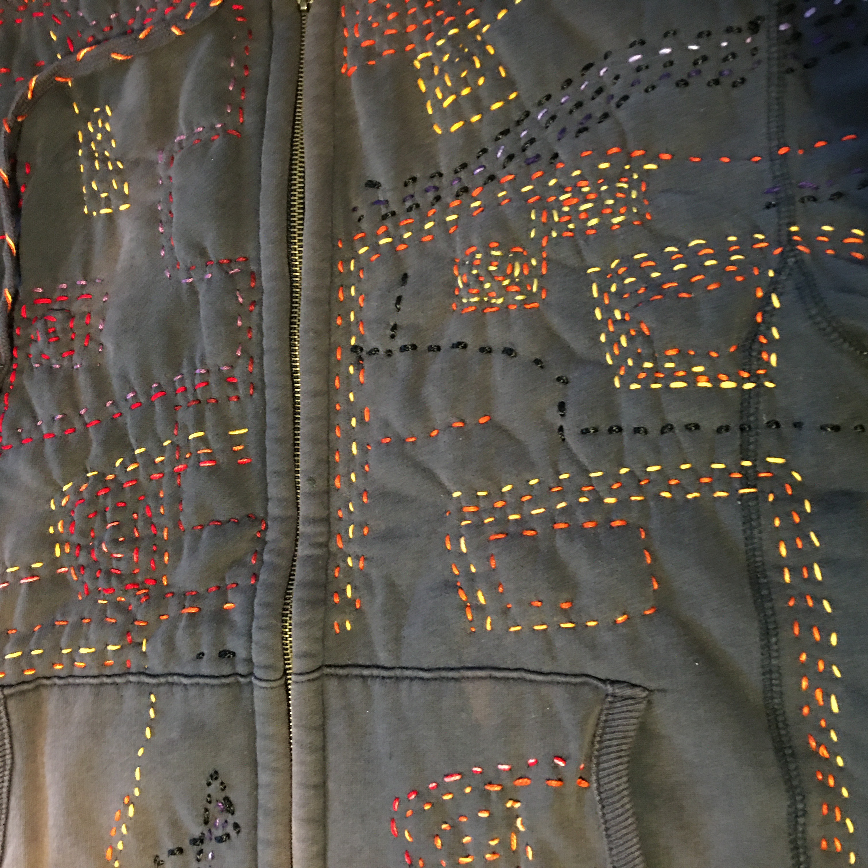Grey sweatshirt with hand embrodiered patches. Skirt not included with purchase.